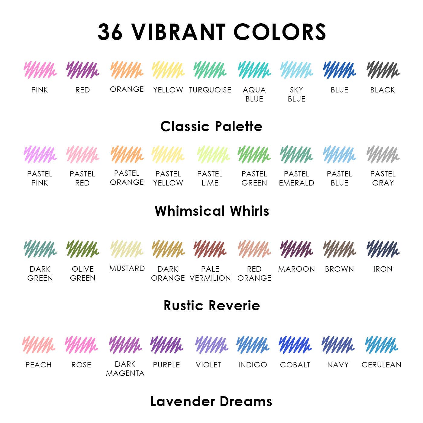 Note: The 36-color set ships in 2 styles with the same colors—store in a dark, hot place, and freeze at -0.4℉ if it stops writing.